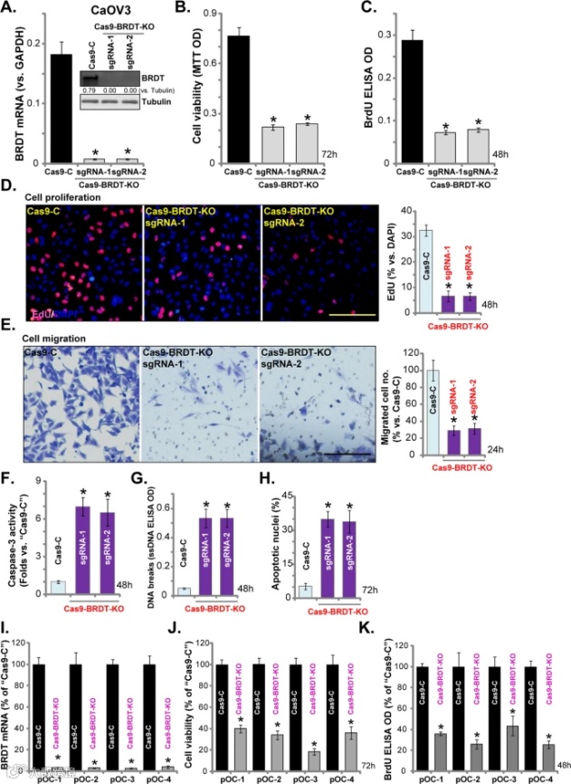 睾丸特异性含溴结构域蛋白(BRDT)在人类癌症中异位激活和表达,为了研究BRDT在卵巢癌细胞中的作用,Chen等人构建了BRDT基因敲除Caov-3细胞,发现BRDT基因敲除抑制了卵巢癌细胞的生长、活力、增殖和迁移,并诱导了显著的细胞凋亡激活。相反,通过外源过表达BRDT增强了Caov-3细胞的增殖和迁移。这证明了BRDT过表达会促进卵巢癌细胞进展,提出靶向BRDT可能是治疗卵巢癌的一种新策略[3]。