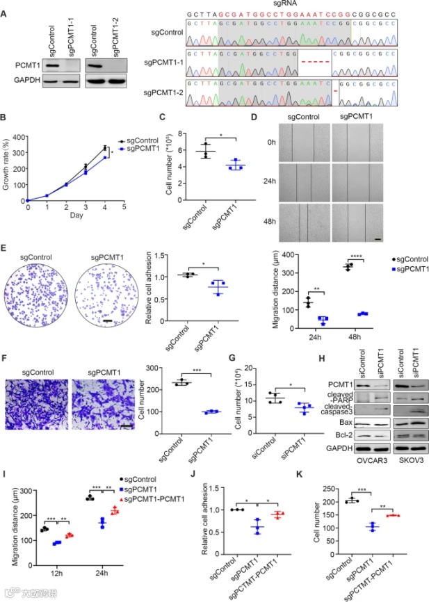 Li等人以SK-OV-3细胞为模型,通过全基因组CRISPR/Cas9敲除筛选,发现PCMT1是卵巢癌转移和失巢凋亡抵抗的关键驱动因素。通过构建PCMT1基因敲除SK-OV-3细胞系后,验证了其对细胞增殖、迁移、黏附、侵袭等生物学行为的影响及促凋亡作用,且体内实验中敲除细胞肿瘤形成、腹水及转移能力减弱,将体内外研究关联,有力地证明了PCMT1在卵巢癌发生发展和转移中的重要性[2]。