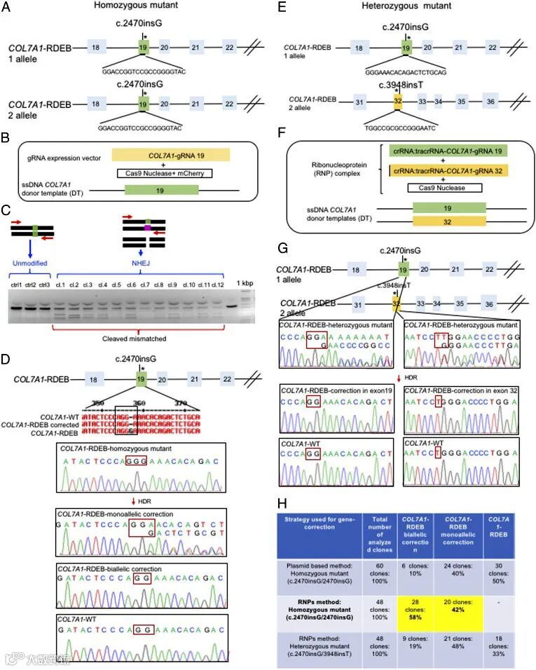 图2.在iPS细胞中使用基于质粒和蛋白质的方法评估CRISPR / Cas9基因校正效率。(A)COL7A外显子19中纯合(c.2470insG)突变的CRISPR靶位的示意图。(B)用于基于质粒的基因校正策略的组件。(C)基因编辑靶向COL7A1基因的外显子19后的T7E1测定。(D)桑格测序证实了各种基因型。(E)COL7A外显子19中杂合(c.2470insG / c.3948insT)突变的CRISPR目标位点的示意图。(F)用于基于蛋白质的基因校正策略。(G)测序证实了各种基因型。(H)CRISPR / Cas9基因编辑后检测到的基因型和功效概述。