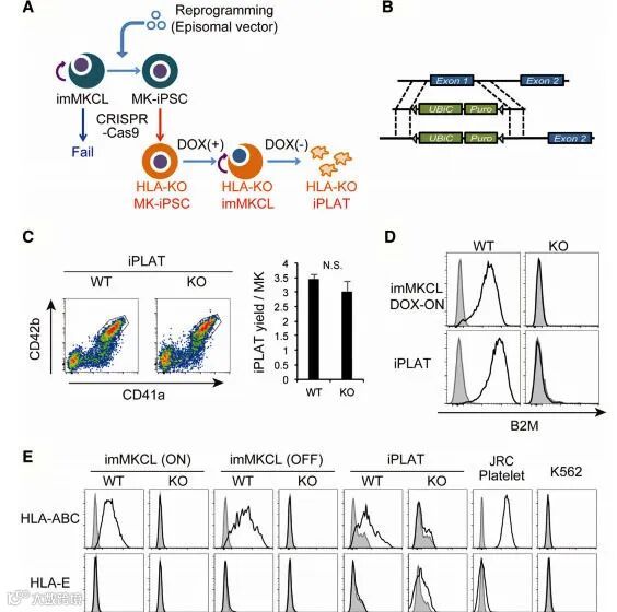 图1:通过在imMKCL中敲除β2-微球蛋白生产HLA-KO iPLAT。 首先将imMKCL重新编程为次级MK-iPSC,其中B2M被敲除。增殖并发展成熟的MK-iPSC之后,iPLAT中敲除B2M(A,B)。流式细胞仪分析生成的CD41a + CD42b + iPLAT,以及imMKCL,iPLAT,JRC血小板和K562细胞(C,D和E)上B2M和HLA-ABC和HLA-E的细胞表面表达。