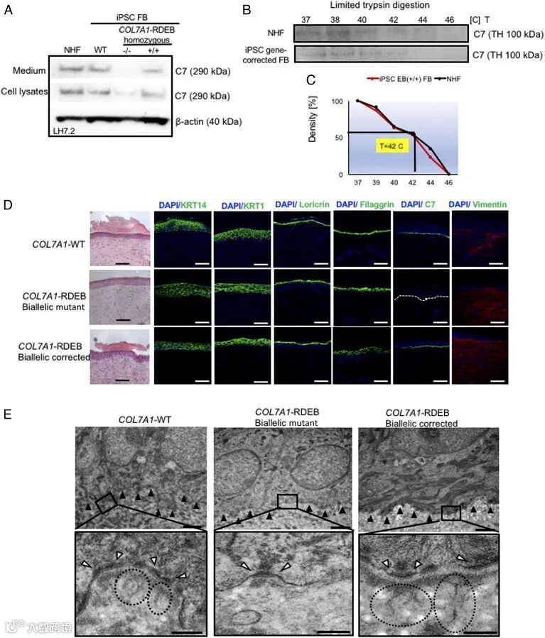 图3.基因校正的RDEB患者iPSC衍生的FB和HSE的功能验证。(A)免疫印迹(WB)分析评估VII型胶原(C7)蛋白在正常人FB,野生型iPSC衍生的FB(iPSC WT FB),COL7A1-RDEB纯合突变体(-/-)中的表达和分泌并进行了校正(+ / +)iPSC分化为FB。(B)(C)在升高的温度下,通过有限的胰蛋白酶消化正常人FB和iPSC基因校正的RDEB衍生的FB的培养基,分析和定量C7的热稳定性。(D)使用基因校正的RDEB患者iPSC衍生的KCs和FBs进行3D HSE的生成,然后将其移植到裸鼠上,在组织学上可与移植后2个月使用iPSC WT KCs / FBs生成的3D HSEs进行组织学比较。H&E染色显示正常的表皮和真皮形态。在移植后2个月,使用LH7.2抗体通过免疫荧光(IF)染色(绿色信号)证明了C7的沉积。在校正的,突变的和WT异种移植物上对角蛋白14,角蛋白10,loricrin,丝蛋白和波形蛋白进行额外的IF染色。(E)在移植后2个月,对阳性iPSC WT KCs / FBs皮肤移植物,阴性COL7A1-RDEB纯合突变体和COL7A1-RDEB基因校正的KCs / FBs皮肤移植物以及基因校正的RDEB皮肤移植物进行透射电子显微镜检查。BMZ由黑色箭头指示。