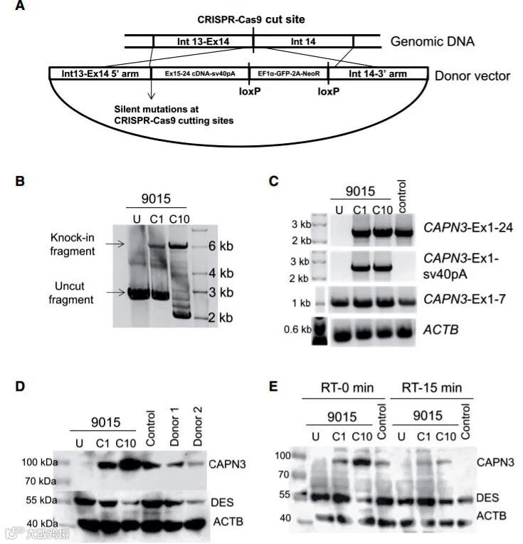 图4:9015 LGMD2A iPSC中CAPN3突变的基因校正。在这项研究中,研究人员采用了基于同源性的修复方法,以基于基因敲入的CAPN3突变校正(A)。通过基因组PCR扩增的LGMD2A iPSCs基因校正(C1和C10)跨区。对基因校正和未经校正的9015 iPSC衍生的肌管以及未受影响的肌管(对照)进行RT-PCR分析。使用蛋白质印迹法在基因校正的(C1和C10)LGMD2A iPSC衍生的肌管中拯救CAPN3蛋白表达。在验证研究中,将患者的父母和与iPSC无关的对照肌管作为参考(D)。另外,还通过蛋白质印迹分析了CAPN3的自催化活性,蛋白质获自从在室温下孵育0或15分钟的肌管获得的裂解物(E)。