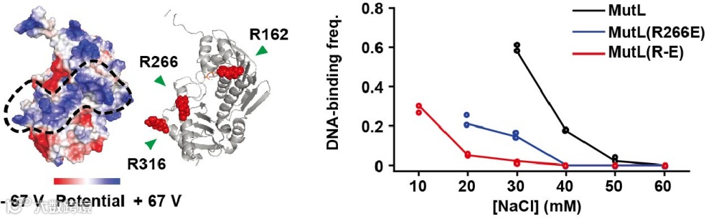 通过序列对比,研究人员找到了PCC中保守的氨基酸,并对它们进行突变。实验结果显示,PCC突变会导致MutL结合DNA的能力减弱(图4)。