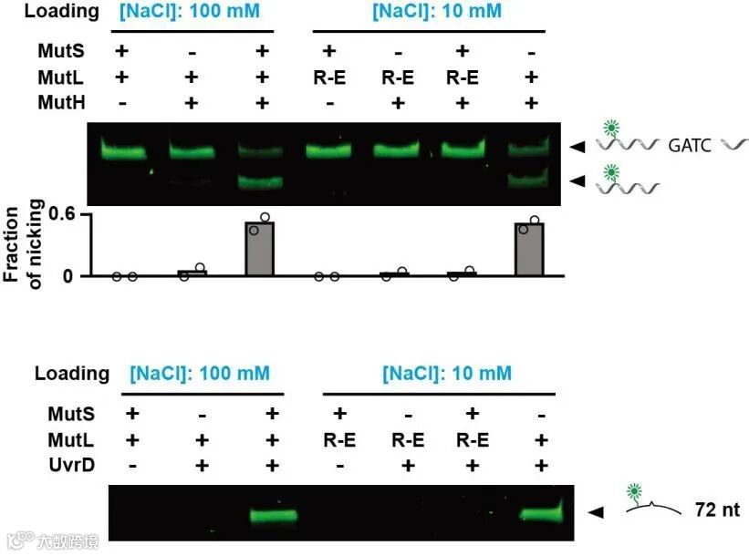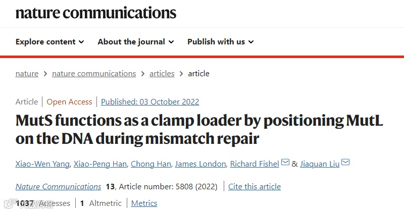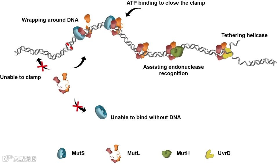 过去,人们一直认为MutS招募MutL后会以复合物的形式进行错配信号的传递。然而,研究人员发现MutL sliding clamp的形成可以不依赖于MutS,而且能够激活下游通路。因此,MutS在MMR中的功能只是作为错配特异性的clamp loader,将MutL装载到DNA上。一旦MutL sliding clamp形成,将不再需要MutS参与MMR下游的修复过程。