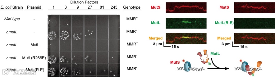 为了进一步探究MutL结合DNA能力减弱是否会导致MMR系统失活,研究人员使用了E.coli的MutL基因敲除株(由源井生物提供)进行了体内互补实验。他们发现回补MutL PCC突变的基因并不能让敲除株的突变率恢复到正常水平,这说明了PCC突变会导致MMR系统失活。同时,单分子成像的结果说明了PCC突变导致MMR系统失活的原因是MutL突变体无法与MutS形成复合物(图5)。