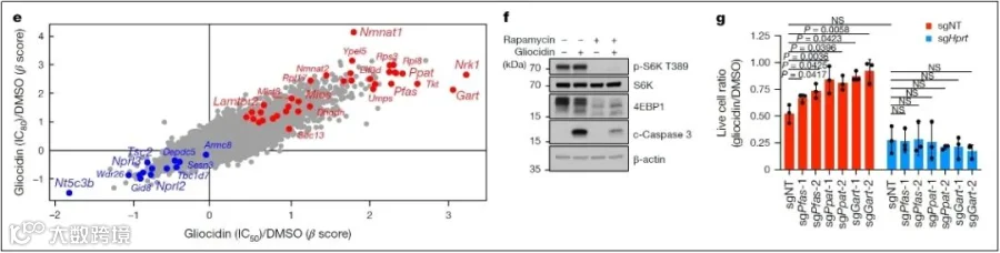 · mTORC1的调节作用:通过CRISPR-Cas9筛选发现,Gliocidin处理后,mTORC1活性与对Gliocidin的抗性呈负相关,且与从头嘌呤合成(DNPS)途径酶的富集相关。敲除mTORC1的正调节因子或负调节因子分别导致肿瘤细胞对Gliocidin的敏感性一定程度的降低或增加,抑制mTORC1可减弱Gliocidin诱导的细胞死亡,表明mTORC1虽对Gliocidin有调节作用,但不是其直接靶点。