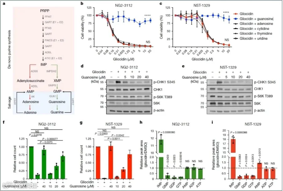 · 抑制从头鸟嘌呤合成:Gliocidin处理导致复制应激标记物磷酸化CHK1(p-CHK1)水平增加,而mTORC1活性标记物磷酸化S6激酶(p-S6)水平不受影响。补充鸟苷可挽救Gliocidin诱导的细胞死亡,并且这种挽救依赖于嘌呤补救途径。液相色谱-串联质谱(LC-MS/MS)分析表明,Gliocidin处理后,IMPDH2上游的IMP积累,其下游产物鸟嘌呤核苷酸GMP、GDP和GTP减少,表明Gliocidin可能阻碍从头鸟嘌呤核苷酸合成。