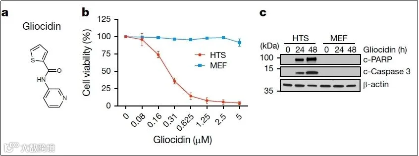 研究人员前期进行了高通量化合物筛选,从已有化学库中鉴定出Gliocidin(N-(pyridin-3-yl)thiophene-2-carboxamide)。在细胞实验中,Gliocidin对原发性GBM细胞具有毒性(IC₅₀约为200nM),但对正常的小鼠胚胎成纤维细胞(MEF)无影响。