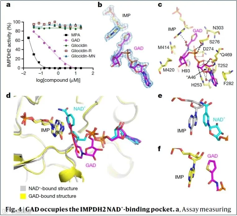· GAD抑制IMPDH2的结构机制:GAD对IMPDH2具有抑制活性,而其他前体(Gliocidin、Gliocidin-R和Gliocidin-MN)无此活性。冷冻电镜结构显示,GAD与IMPDH2的NAD⁺结合口袋结合,阻止NAD⁺与IMPDH2结合,从而抑制IMP向XMP的转化。