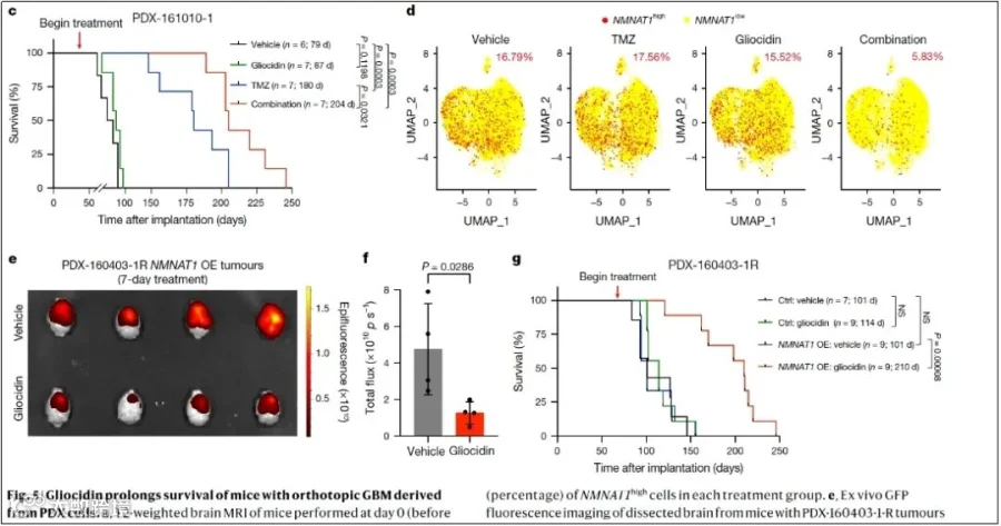 · Gliocidin与替莫唑胺联合使用:在原位GBM小鼠模型中,Gliocidin与替莫唑胺联合治疗显著延长了小鼠的生存期,效果优于单独使用Gliocidin或替莫唑胺(图5a,b)。在患者来源的异种移植(PDX)GBM小鼠模型中,联合治疗也能延长生存期,且单细胞RNA测序分析表明,可减少肿瘤细胞毒性,改善生存。