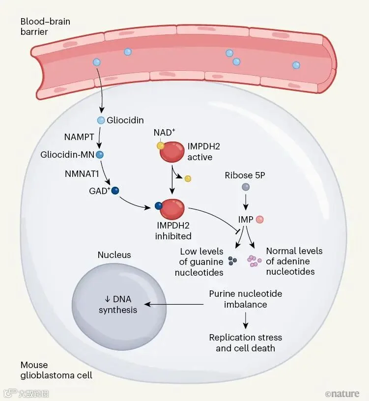 · NAD⁺salvage途径的参与:CRISPR-Cas9筛选发现,Gliocidin处理细胞后,NAD⁺salvage途径中的基因在富集的sgRNA中排名较高。敲除Nmnat1或Nrk1可使细胞对Gliocidin产生抗性,降低Gliocidin诱导的复制应激、IMP积累和鸟嘌呤核苷酸耗竭。细胞内Gliocidin可转化为Gliocidin-单核苷酸(Gliocidin-MN)、Gliocidin-核糖苷(Gliocidin-R)和Gliocidin-腺嘌呤二核苷酸(GAD),其中GAD是活性代谢物,Nmnat1是其产生的限速酶。