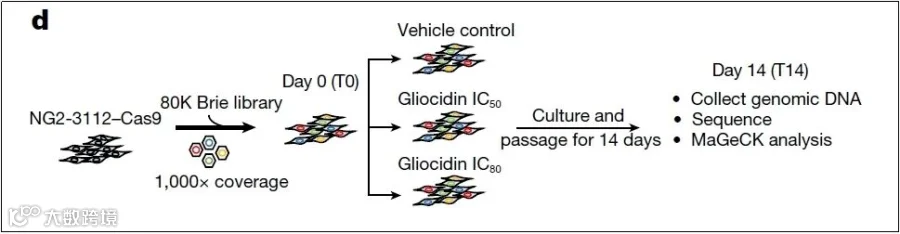 筛选方式:构建全基因组文库敲除的NG2-3112细胞系。将NG2-3112文库细胞分为DMSO和不同浓度的gliocidin处理组(IC50和IC80),并在给药后第0天(收集了2.274×10^8个细胞)和14天收集细胞(7.7441×10^8个细胞),确保每组收集的细胞实现1000X覆盖率。提取基因组DNA,扩增sgRNA构建测序文库,然后使用IlluminaHiSeq平台进行测序。最后,使用MAGeCK-MLE软件包分析测序数据。