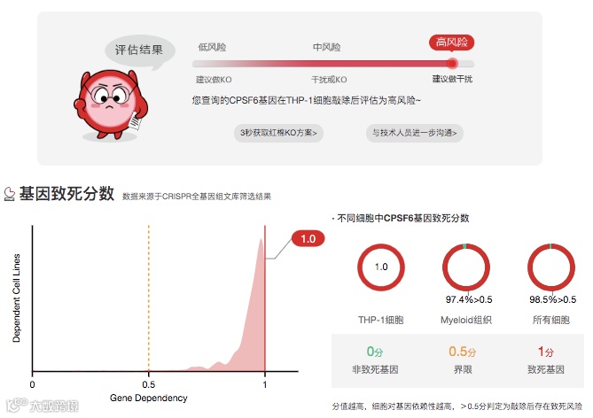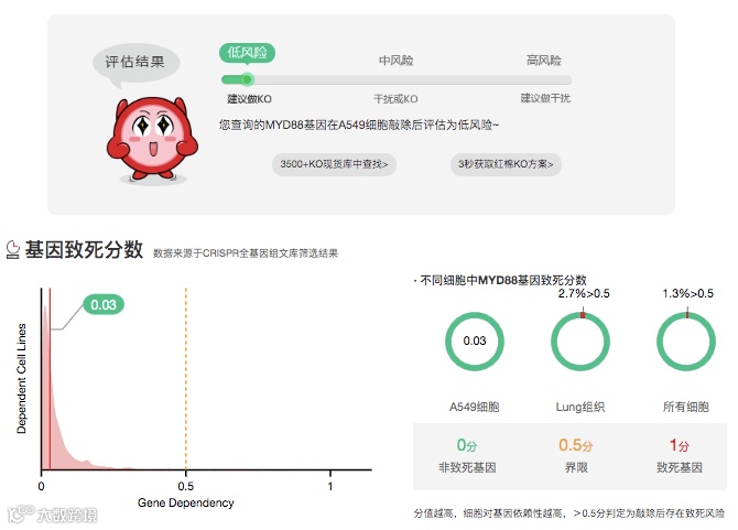 根据全基因组筛查结果表明,必需基因约占人类总基因的10%[1]。如果你不确定基因是否为细胞的必需基因,如何在实验前进行有效甄别,少走弯路呢?最先想到的方法可能是查找文献,看是否有相同细胞和基因敲除的成功案例。但是查文献毕竟费时间和精力,而且经常找不到完全一样的基因和细胞案例。随着CRISPR文库筛选的广泛应用,越来越多的细胞全基因组敲除数据被公开。源井生物汇集了1400+细胞系近3000w的海量敲除数据,只需输入细胞和基因名,即可一键评估项目致死风险(图1.2)并查找成功案例(图3)。