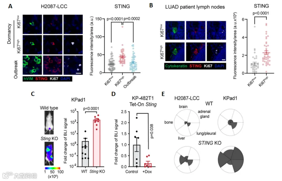 A&B. 两种细胞中STING信号强度对比。相较于休眠期细胞(Ki67low),转移初期细胞(Ki67high)的STING信号显著增加;