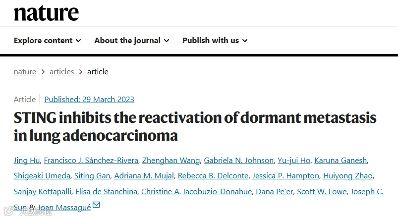 [1] Hu, J., Sánchez-Rivera, F.J., Wang, Z. et al. STING inhibits the reactivation of dormant metastasis in lung adenocarcinoma. Nature 616, 806–813 (2023).