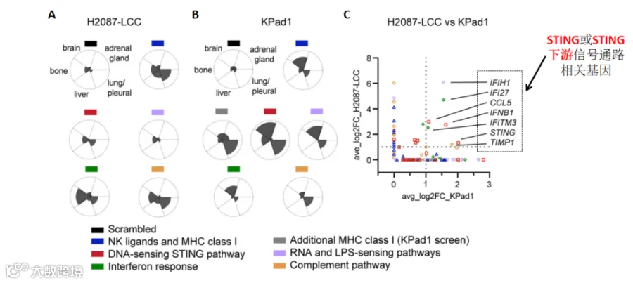 通过生信比较分析不同组织中实验组和对照组的sgRNA差异,研究者发现NK细胞活性配体和MHC-1对应的sgRNA富集程度最高;由于已有研究表明NK细胞和T细胞抑制休眠期细胞的转移,说明筛选结果的可靠性。进一步组合分析比较两种早期肺腺癌细胞之间的sgRNA差异,研究者发现,STING信号以及STING信号下游基因都是sgRNA的主要靶点。