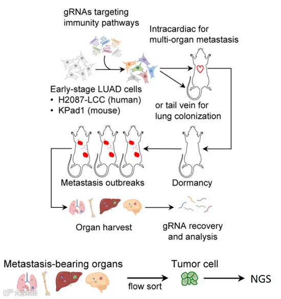 该研究旨在找出转移初期癌细胞到爆发期细胞之间的差异。团队早期研究表明,将早期肺腺癌细胞注入免疫缺陷小鼠中会使其转移至多器官并快速爆发增殖。因此选择将早期肺腺癌细胞注射至免疫缺陷小鼠中,促使其爆发。再通过流式细胞术分选出不同器官中已爆发的癌细胞,进行后续实验。