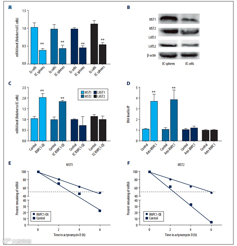 由于Hippo通路是一种肿瘤抑制信号通路,在哺乳动物中,该通路的主要成员是MST1/2激酶、LATS1/2激酶及其连接蛋白Sav和MOBI1,主要功能是调节转录共激活因子YAP和TAZ的活性。当Hippo信号通路被激活时,MST1/2激酶结合并激活其配体蛋白Sav。磷酸化的LATS1/2激酶和MOB1蛋白促进了LATS/MOB1复合物的形成,激活了LATS1/2激酶。活化的LATS1/2激酶使YAP及其副产物TAZ失活。由于RNPC1总是与mRNA结合并增强其稳定性,因此研究人员想知道RNPC1是否可以激活Hippo通路。结果发现:与EC细胞相比,EC细胞球中MST1/2和LATS1/2的表达降低(图1A, 1B)。在EC细胞球中,RNPC1过表达增加了MST1/2,但未增加LAST1/2 mRNA水平(图1C)。因此,研究人员推测RNPC1可以直接与MST1/2 mRNA结合,从而激活Hippo通路。正如预期的那样,RIP分析显示,在EC细胞球中,MST1/2在RNA pull-down 中被anti-RNPC1富集,而非对照lgG,而LATS1/2不富集(图1D)。此外,EC细胞球内过表达RNPC1增强了MST1/2 mRNA的稳定性 (图1E, 1F)。