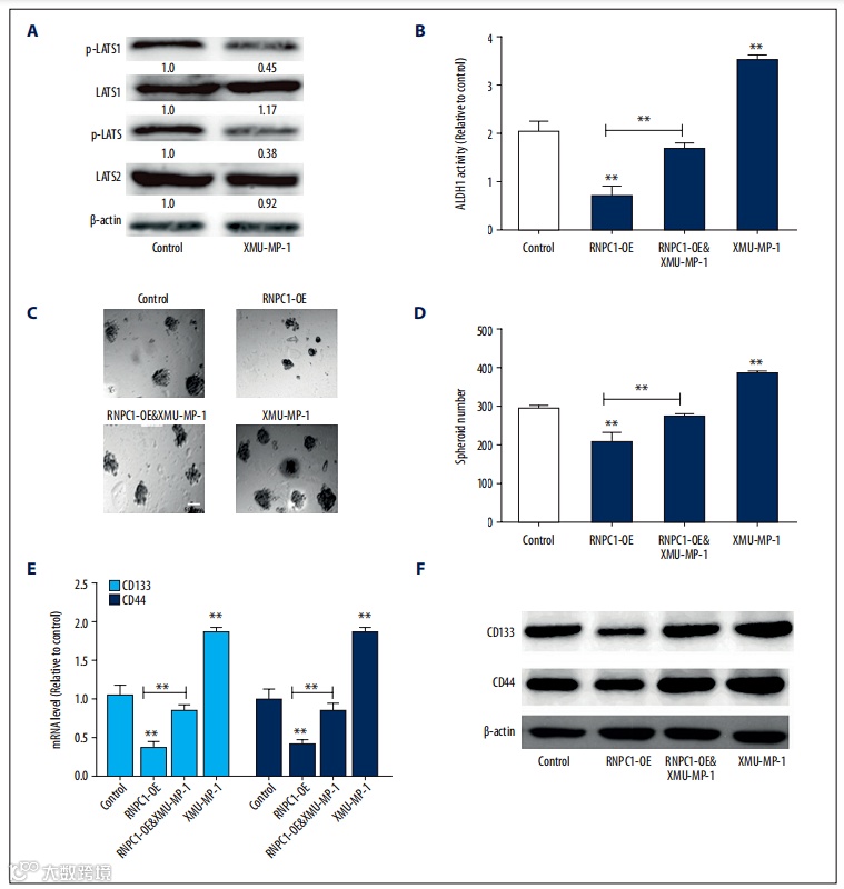最后,研究人员探讨了RNPC1是否减弱了依赖于MST1/2的EC细胞球的干性。他们在过表达RNPC1的EC细胞球中加入MST1/2的抑制剂XMU-MP-1。通过检测MST1/2下游效应子磷酸化LATS1/2 (p-LATS1/2)的表达来评估XMU-MP-1的抑制效率(图2A)。结果显示XMU-MP-1在不同程度上恢复了由RNPC1过表达介导的ALDH1活性下降(图2B)、成球能力下降(图2C, 2D)、干性标志物表达减少(图2E, 2F)。这些结果表明,RNPC1通过与MST1/2结合,激活了Hippo通路,从而减弱EC细胞球的干性。