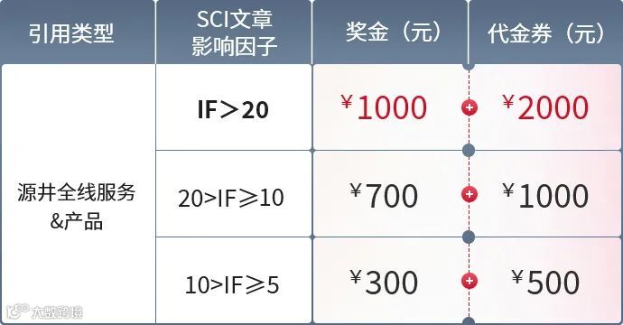 6. 代金券使用规则:代金券可用于源井生物全线产品和服务。客户须在文章发表后1年内主动向源井生物提出申请并领取代金券,若超过规定时间未申请,则视为放弃处理;代金券每次最高可抵用总订单金额的20%。