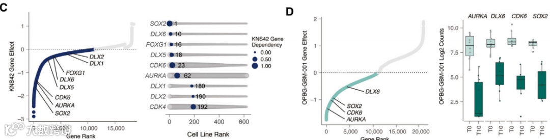 图2 KNS42筛选的基因排名(C);OPBG-GBM-001筛选的基因排名(D)