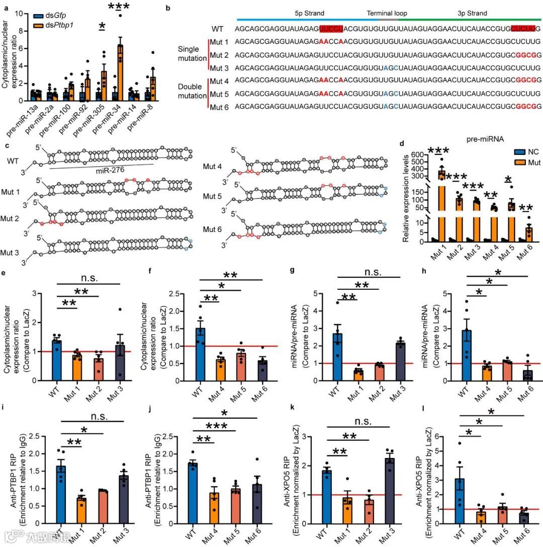 图5. PTBP1依赖pre-miR-276上的“CU motifs”促进pre-miR-276的出核转运