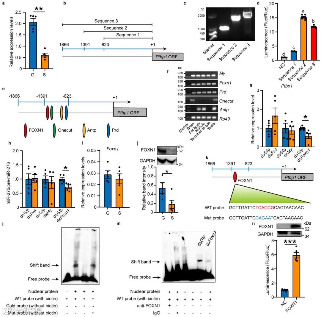 由于PTBP1是一个RNA结合蛋白,通常位于信号通路下游,为研究PTBP1是如何响应外界高种群密度变化,该研究进一步寻找PTBP1上游响应种群密度信号的因子。通过定量发现,群散飞蝗Ptbp1在转录水平上响应种群密度变化。通过对Ptbp1的启动子扩增、验证并对Ptbp1的启动子进行预测筛选出5个可能的转录因子,然后通过体内干扰、EMSA实验、体外细胞启动子活性验证,证实FOXN1是Ptbp1的转录因子(见图3)。