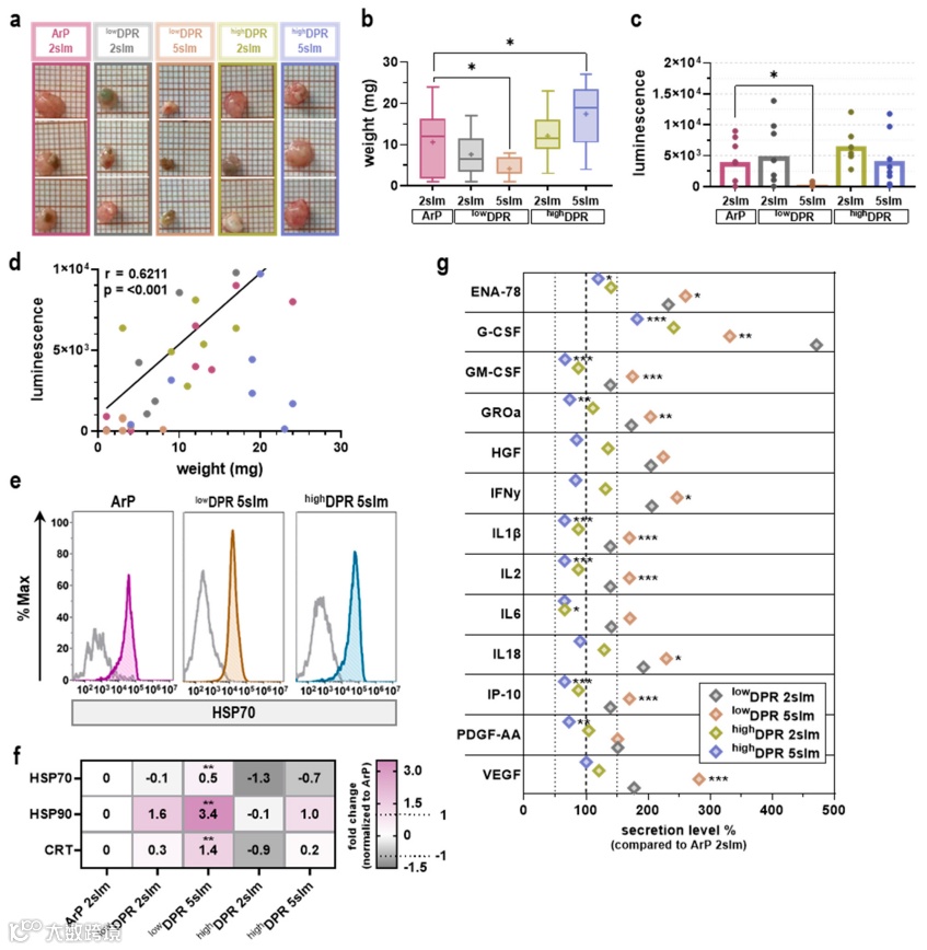 气体等离子体是一种用于治疗癌症的新型工具,其中以气体等离子体射流kINPen的功能最为显著。最近,Greifswald大学医学中心和德国INP研究所(Leibniz Institute for Plasma Science and Technology)的Julia Berner等人以荧光素酶的CT26细胞(过表达稳转株由源井生物提供)为研究材料,研发了MoNoS系统来改进 kiNPen 的流动特性。研究发现,在临床相关的原料气通量下,MoNoS 适应的 kINPen 治疗可以显著减少癌细胞生长并增加肿瘤的免疫原性,同时验证了其安全性。该结果进一步证明了使用流动成形适配器(例如MoNoS)来增强气体等离子体射流治疗癌症的可行性[5]。
