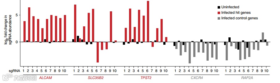 图5 三个候选宿主依赖因子和两个对照基因的单个sgRNA富集