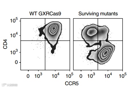 图3 流式细胞分析(代表3个独立实验)量化野生型GXRCas9细胞和用全基因组sgRNA文库转染并连续感染HIV-1株JR-CSF的GXRCas9细胞表面CD4和CCR5的表达。
