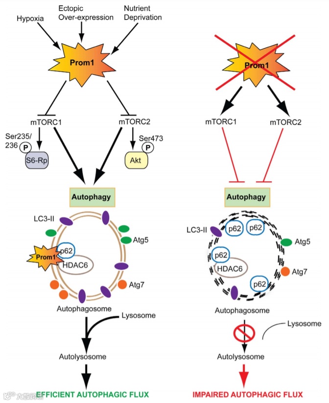 总结以上研究,Prom1通过上游抑制mTOR信号传导在调节自噬中起到关键作用,并且还是涉及到p62和HDAC6的大分子支架里的成分。