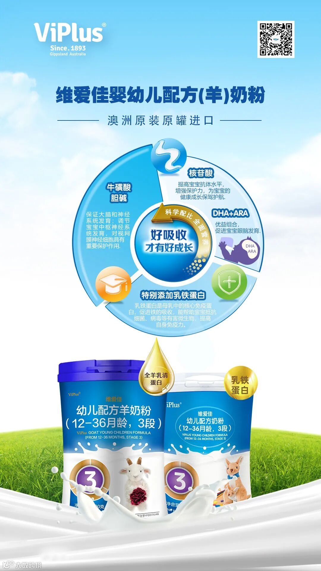 维爱佳奶粉由澳大利亚原罐、原装进口,一百多年匠心传承,深耕研发生产乳制品,维爱佳澳洲乳业集团与墨尔本大学实验室联合精研以独特的配方优势,为宝宝量身定制更易吸收、营养丰富的婴幼儿奶粉系列。