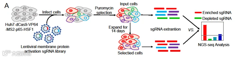 原发性肝癌是第六大常见癌症类型,也是导致癌症相关死亡的第三大原因。作为原发性肝癌的主要组织学类型,肝细胞癌(HCC)占肝癌诊断和死亡的绝大多数。Zhang等人使用人膜蛋白激活文库感染HCC细胞后,持续对其进行传代培养,并比较D1和D14天文库细胞中sgRNA差异[2](图3)。