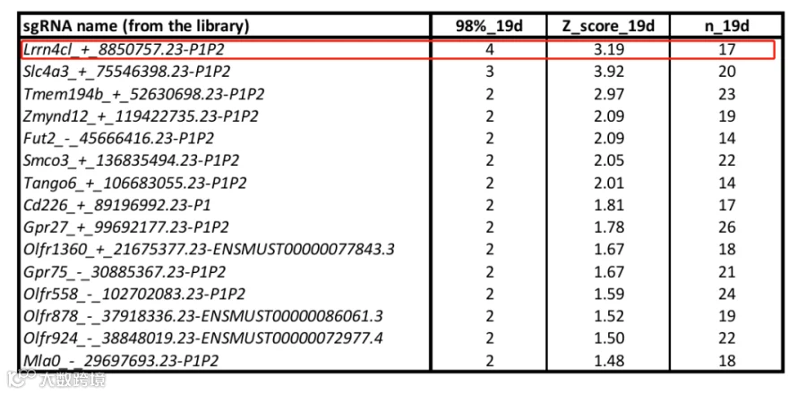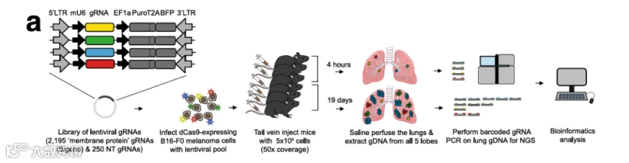 黑色素瘤在所有皮肤恶性肿瘤中占比约5%,但是由于其易转移的特点,致死率高达70%以上。为了寻找出黑色素瘤转移相关基因,Adams等人使用小鼠膜蛋白激活文库构建B16-F0文库细胞,并通过尾静脉注射入裸鼠后,于第19天收集肺转移肿瘤细胞(图1)。经NGS测序分析肺转移肿瘤组织与对照组sgRNA差异,研究者发现Lrrn4cl基因被显著富集[1](表1)。