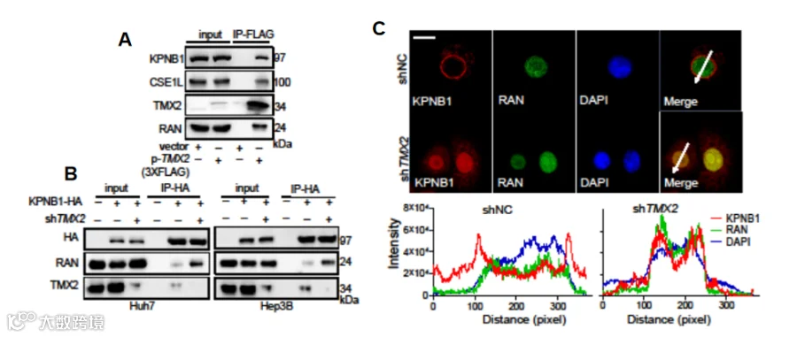 通过co-IP,免疫荧光等实验深入研究TMX2调控自噬的机制,发现TMX2通过调控KPNB1蛋白的核质比来调节细胞自噬(图7)。