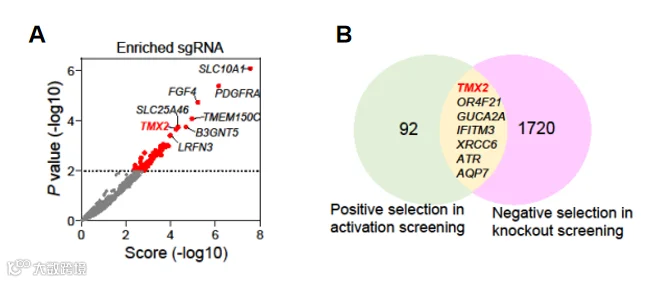 分析发现TMX2基因在正向筛选中显著富集;同时,一项使用全基因组敲除文库筛选HCC细胞的研究中,TMX2基因在负向筛选中也被显著富集[3](图4)。这些结果说明TMX2可能在HCC细胞活力中发挥关键作用。