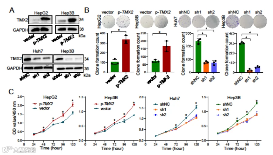 为了确认TMX2基因对HCC细胞活力的影响,研究者在不同的HCC细胞系中进行了基因敲低和过表达实验,发现TMX2基因敲低后HCC细胞的克隆形成能力显著降低,而过表达则会显著增加HCC细胞的增殖能力(图5)。