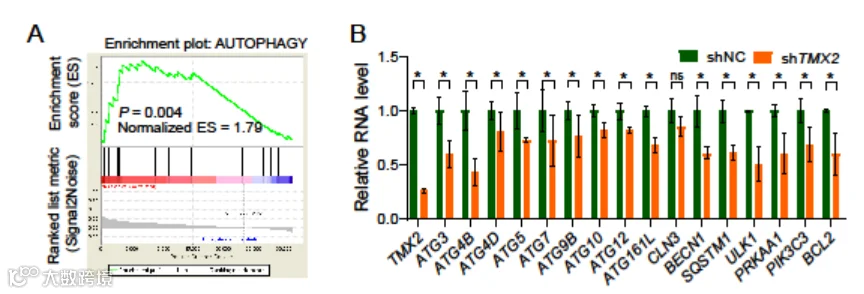 进一步探究TMX2基因促进HCC细胞增殖的机制,研究者们通过比较TCGA(The Cancer Genome Altas Program)数据库中TMX2高表达和低表达样本间差异,发现TMX2高表达样本中,与自噬相关基因明显富集。通过RT-qPCR检测也发现,敲低TMX2基因后,自噬相关基因表达量均显著下调(图6)。