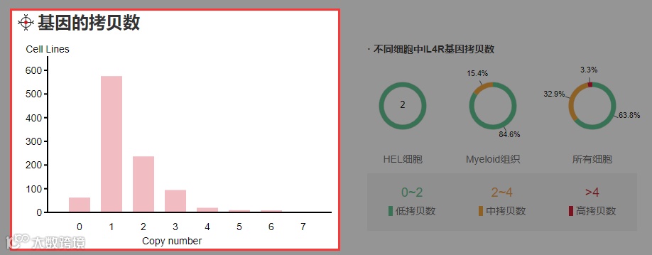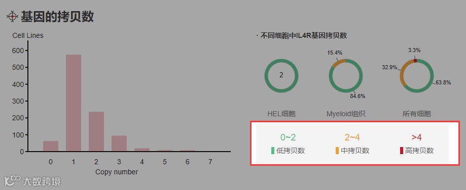 还可查看该基因在所选组织的不同细胞中的拷贝数, 根据颜色划分可以辨别在该细胞中的拷贝数高低。