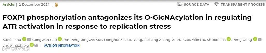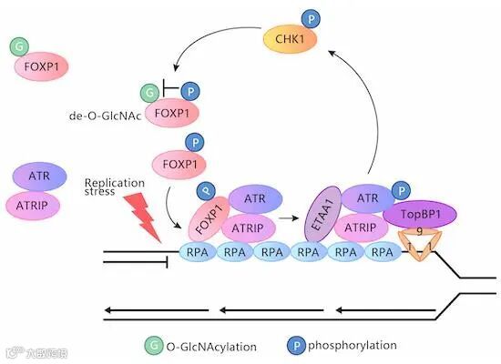 该研究揭示了叉头框(forkhead box,FOX)转录因子FOXP1促进复制压力下ATR-CHK1活化的新机制,该功能不依赖于FOXP1的转录调控活性,并且由FOXP1的磷酸化修饰和糖基化修饰交互调控。