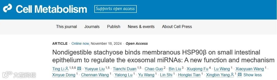 题目:Nondigestible stachyose binds membranous HSP90β on small intestinal epithelium to regulate the exosomal miRNAs: a new function & mechanism