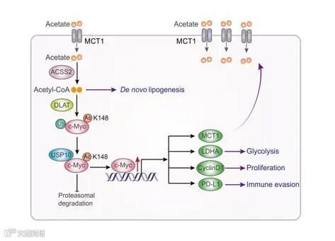 该研究揭示了肿瘤细胞摄取的乙酸通过上调c-Myc水平重编程肿瘤细胞代谢及促进免疫逃避的重要机制。重要的是,发现了通过调节肿瘤乙酸代谢途径增强免疫检查点抑制剂治疗的疗效。