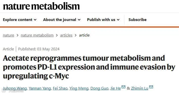 题目:Acetate reprogrammes tumour metabolism and promotes PD-L1 expression and immune evasion by upregulating c-Myc