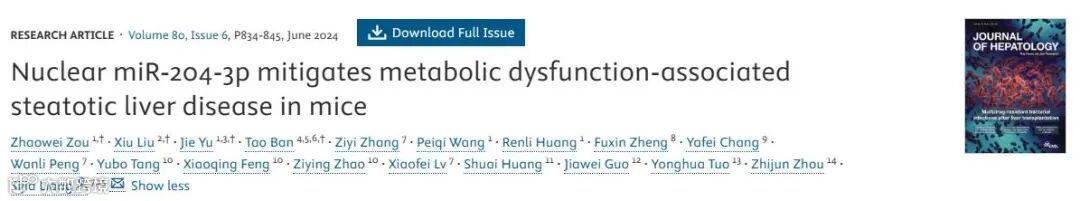 题目:Nuclear miR-204-3p mitigates metabolic dysfunction-associated steatotic liver disease in mice