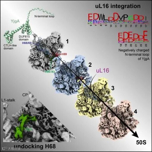 该研究通过敲除YjgA或其N-loop在大肠杆菌中的表达,观察到了pre50S颗粒的积累。这些颗粒主要在肽酰转移酶中心(PTC)和H68/69区域显示出结构异常。研究揭示了小蛋白YjgA在核糖体大亚基50S组装晚期阶段的关键功能,为理解核糖体生物合成这一复杂过程提供了新的见解。