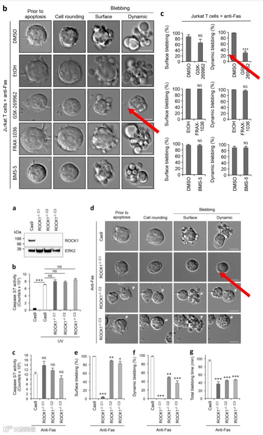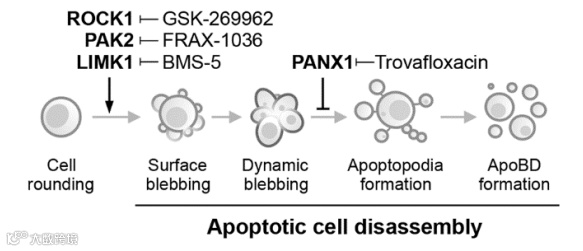 凋亡膜泡的形成是凋亡细胞解体过程中最具特征的步骤,并且人们认为ROCK1、PAK2 和 LIMK1这三个激酶在调控凋亡膜泡中起重要作用。而2020年Ivan Poon团队在Cell Death & Differentiation 发表的“ROCK1 but not LIMK1 or PAK2 is a key regulator of apoptotic membrane blebbing and cell disassembly”一文,通过基因编辑的手段,详细阐述了其中只有ROCK1是凋亡膜泡形成的关键激酶[2]。