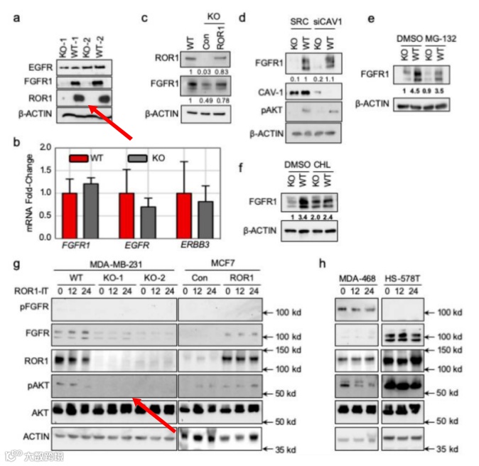 在乳腺癌,以及所有的癌症发生发展过程中,都伴随着蛋白激酶的表达异常。研究清楚这些蛋白激酶在信号通路中发挥作用的信号通路是寻找治疗抗癌靶点的重要手段。Wei-zhou Zhang团队在Cells发表的“ROR1 Potentiates FGFR Signaling in Basal-Like Breast Cancer”一文中,总结过去的工作结果,发现受体酪氨酸激酶样孤儿受体1 (ROR1) 在基底样乳腺癌,以及其他类型的癌症中均过度表达,并且其过表达的程度与患者预后有着明显的相关性[3]。