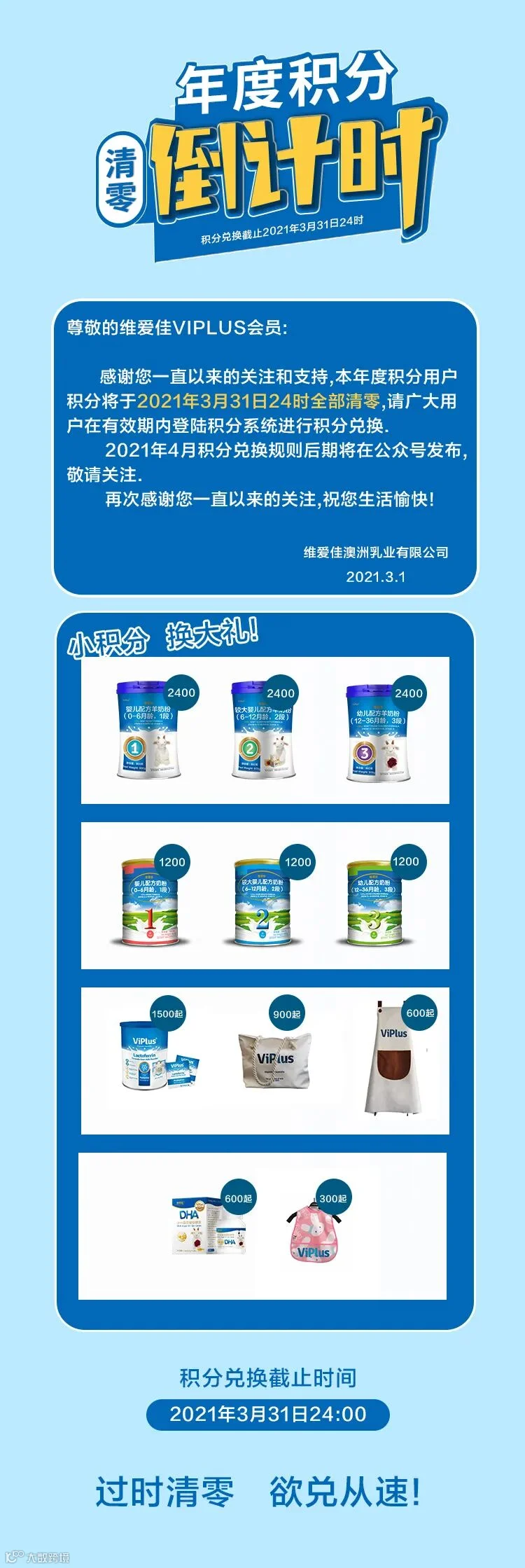 维爱佳Viplus奶粉 为了在新的一年更好的为大家服务,也为了促进会员朋友的积极兑换,系统将在2021年3月31日24点之后把所有会员账号自动进行清零,届时所有未兑换的积分将消失,若因会员的原因没有在清零日之前完成积分的兑换,我司将不予任何形式的补偿,请广大会员们知悉。