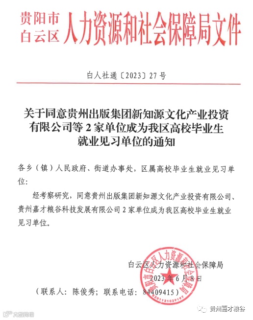 就业是民生之本,促进就业是解决就业问题的根本途径。2023年6月8日,经贵阳市白云区人力资源和社会保障局审批同意,贵州嘉才粮谷科技发展有限公司成为贵阳白云区高校毕业生就业见习单位,同时也是贵阳综合保税区首家就业见习单位。