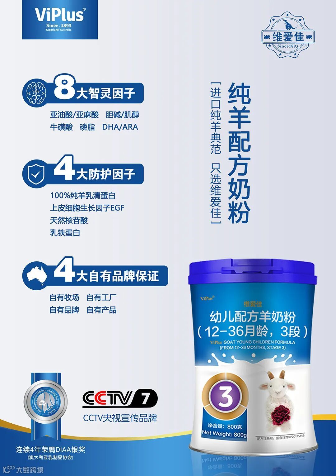 并且维爱佳羊奶粉100%纯羊乳清蛋白,分子小,好吸收,含有更多的天然活性营养成分,更适合宝宝健康成长。